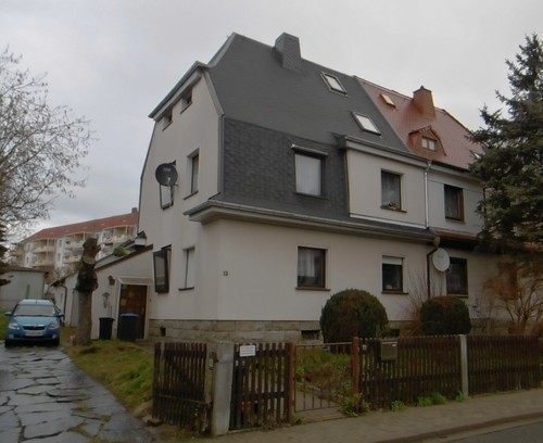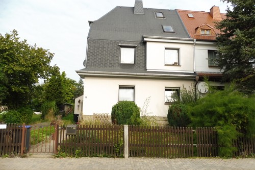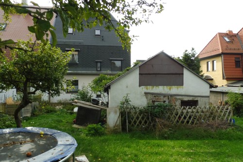 Das Grundstück ist mit einer Doppelhaushälfte bebaut, welche 1926 errichtet wurde. Das unterkellerte, zweigeschossige Wohnhaus mit einer Wohnfläche von ca. 133 m² verfügt im Kellergeschoss über Abstellräume sowie Gaszentralheizung und Hausanschlussraum, Waschmaschinenstellplatz; im Erdgeschoss mit ca. 53 m² befinden sich Flur, Küche und 2 Wohnräume sowie WC auf halber Treppe; im Obergeschoss (ca. 50 m²) Bad mit Wanne, HWB, WC und Duschkabine sowie 2 Wohnräume incl. kleinem Kaminofen. Das Dachgeschoss (ca. 30 m²) verfügt über Schlaf- und Kinderzimmer nebst Zugang zum Spitzboden. Im Jahr 2015 erfolgten Modernisierung bzw. Erneuerung von Dacheindeckung, Elektroinstallation und Bad. Andere Maßnahmen liegen schon länger zurück (1992). Die Innenräume sind einfach ausgestattet mit Steinzeug, Fliesen bzw. Laminat, Tapeten und Holzverbundfenstern. Über das Grundstück verlaufen die Versorgungsleitungen vom Hausanschluss bis an das öffentliche Netz. Weiterhin finden sich eine einfache Wegbefestigung, ein Zaun als Einfriedung sowie eine Garage und ein Schuppen (wesentlich unzeitgemäß, abgewirtschaftet, teilweise vermüllt). Insgesamt befindet sich das Grundstück in einem vernachlässigtem Zustand.