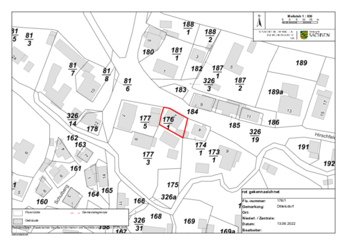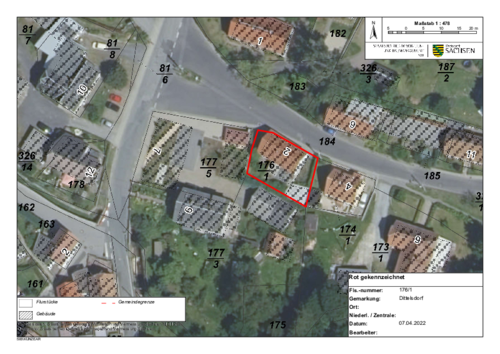 Das Verkaufsobjekt befindet sich im Ortsteil Dittelsdorf und ist gut zugänglich. Es handelt sich um das Flurstück Nr. 176/1 der Gemarkung Dittelsdorf mit einer Größe von 257 m². Dieses ist bebaut mit einem unsanierten zweigeschossigen, teilunterkellerten Einfamilienhaus.