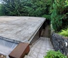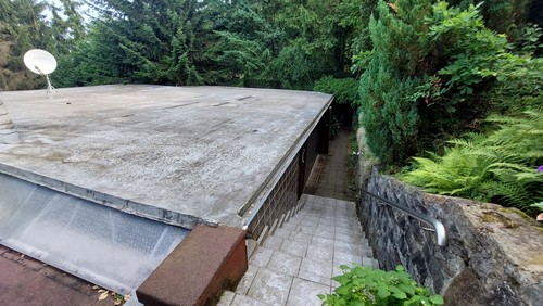 Das Grundstück, von der Straße ab teilweise stark hangig abfallend, ist mit einem ebenfalls deutlich unter Straßenniveau befindlichen eingeschossigen und nicht unterkellerten Wohnhaus mit Flachdach und seitlichen Anbau bebaut. Das Gebäude wurde 1973 errichtet, ca. 1993 erfolgte der Einbau einer Gasheizung mit Flachheizkörper; 2015 Nachrüstung vollbiologische Kläranlage; 2018 Nachrüstung elektrische Rollläden; 2023 Erneuerung Gastank. Das Wohnhaus verfügt über eine ungewöhnliche Grundrissgestaltung; Diele mit offenem Zugang zum großzügigen Ess- bzw. Wohnbereich mit dazu seitlich angeordneten kleineren Räumen als Bad, Schlafzimmer, Küche mit Vorratsraum und Gästezimmer zzgl. teilweise überdachter Terrasse, Baujahr 1980, mit Anbau sog. Kaminzimmer (Zugang zum Wohnbereich) und gemauertem Kamin. Auf dem Grundstück befinden sich ferner eine Garage, Baujahr 1974 mit ca. 20 m² und eine Sauna auf Höhe des Wohngebäudes im nordöstlichen Grundstücksbereich mit einer Grundfläche von 39 m², Baujahr ca. 1985/86 (ursprünglich als Gewächshaus, Sauna und Werkstatt errichtet und genutzt). Das Grundstück stellt sich als sehr hangiges, waldähnliches Gelände mit vielfältigem und pflegebedürftigen Baumbestand dar; einige Laufwege (Betonplatten), treppenanlagen, vielfältigen Stützmauern, Einfriedungen durch Zaun und Hecken. An der Straße oberhalb des Grundstücks befinden sich weder Gehwege noch Parkmöglichkeiten.