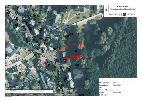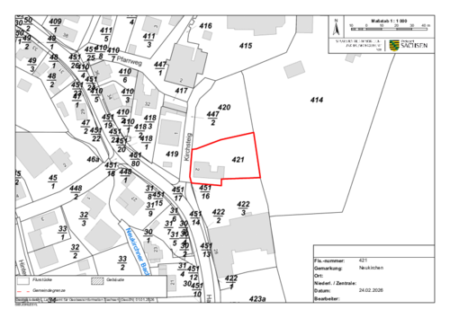 Neukirchen/Erzg. liegt im Westen des Freistaates Sachsen im Erzgebirgskreis, etwa 8 km südwestlich von Chemnitz. Die Gemeinde befindet sich am Nordrand des Erzgebirges im Tal der Würschnitz und bildet den Übergang zwischen städtischem Umland und Mittelgebirgslandschaft. Neukirchen liegt verkehrsgünstig nahe der A72 mit guter Anbindung an Chemnitz und das überregionale Verkehrsnetz. Gleichzeitig bietet die Umgebung mit Wäldern und ländlichen Strukturen zahlreiche Möglichkeiten für Freizeit und Erholung. Das zum Verkauf stehende Grundstück befindet sich im östlichen Ortsgebiet nahe der Gemeindeverwaltung in guter Wohnlage mit teilweise fußläufig erreichbarer Infrastruktur wie Schulen, Kita, Ärzte, Geschäfte täglichen Bedarfs. Das Grundstück befindet sich in der archäologischen Schutzzone (historischer Ortskern, Mittelalter.
