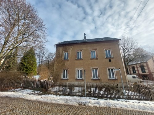 Das großzügige Grundstück ist mit einem etwa um 1900 errichteten, zweigeschossigen Wohnhaus mit ausgebautem Dachgeschoss und Spitzboden bebaut. Ein Drittel des Gebäudes ist unterkellert. Im Erdgeschoss befinden sich Hauseingang und Flur mit davon abgehenden Wohnraum, Schlafraum sowie Kühe und Bad sowie ein Podest-WC und der Abgang zum Gartenausgang bzw. Keller; das Obergeschoss verfügt über Flur und vier Räume, einer davon mit abgetrenntem Bad; weitere Räumlichkeiten im nicht begehbaren Dachgeschoss; Lagerfläche im Spitzboden. Das Wohnhaus wurde kaum modernisiert; augenscheinlich erfolgte lediglich in den 1990er Jahren der Einbau der Bäder. Anbindung an Wasser- und Abwasserkanalnetz besteht; vermutlich noch vorhandene ehemalige Klärgrube im nördlichen Grundstücksbereich unbekannten Zustandes. Keine Zentralheizung, einzelne Räume mit ehem. Gasaußenwandheizern und ansonsten vereinzelt Elektroheizer vorhanden. Schäden an der Dacheindeckung, insbesondere im nördlichen Gebäudebereich, mit folglich massiven Einregnungsschäden bis ins Obergeschoss, teilweise mit Moos- und Schimmelbildung. Der bauliche Zustand des Gebäudes mit allgemein unwirtschaftlichem Grundriss ist schlecht; augenscheinlich erfolgten seit Erbauung keinerlei durchgreifende Instandsetzungs- und Modernisierungsmaßnahmen und nur notwendigste und sporadische Instandsetzungsmaßnahmen. Anbauten am östlichen Teil des Wohnhauses inkl. Einzelgarage in Holzbauweise. Das Grundstück mit Wiesenfläche und befindet sich in einem ungepflegten Zustand.